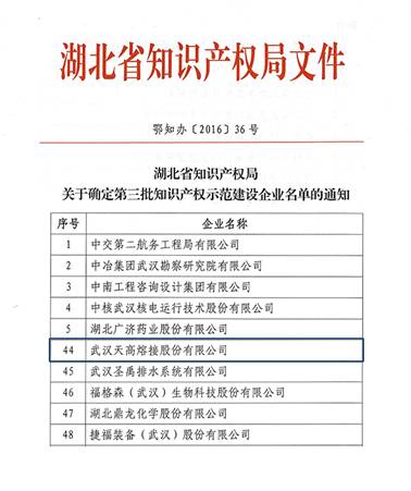 天高股份獲評(píng)湖北省第三批知識(shí)產(chǎn)權(quán)示范建設(shè)企業(yè)