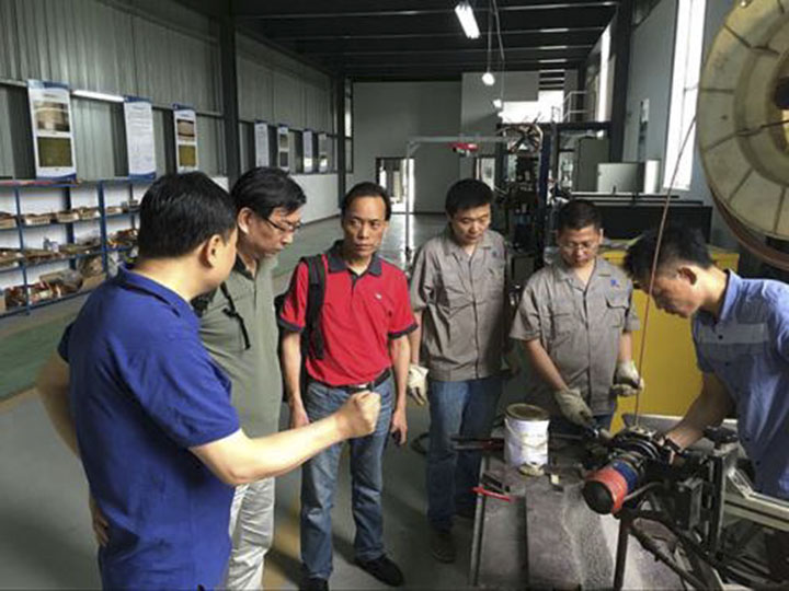 6月15日上午,上海外高橋造船有限公司副總經(jīng)理陳剛博士、科技管理部部長(zhǎng)張學(xué)輝等一行專家代表團(tuán)到武漢理工大學(xué)、天高股份及子公司—理工船舶考察交流?,F(xiàn)場(chǎng)觀看高效埋弧焊接工藝演示期間,考察團(tuán)分組成員參觀天高股份技術(shù)中心,現(xiàn)場(chǎng)觀看高效埋弧焊接工藝演示,詳細(xì)了解高效埋弧焊接材料的研制、供貨、生產(chǎn)技術(shù)條件。在了解到雙絲雙面單道埋弧焊接工藝及材料填補(bǔ)國(guó)內(nèi)空白時(shí),焊接專家喻軍、唐連元對(duì)我司創(chuàng)新產(chǎn)品給予