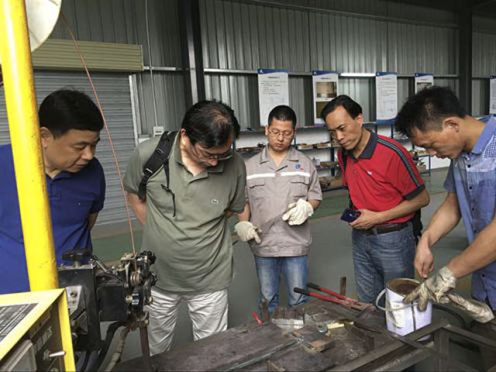 期間,考察團(tuán)分組成員參觀天高股份技術(shù)中心,現(xiàn)場觀看高效埋弧焊接工藝演示,詳細(xì)了解高效埋弧焊接材料的研制、供貨、生產(chǎn)技術(shù)條件。在了解到雙絲雙面單道埋弧焊接工藝及材料填補(bǔ)國內(nèi)空白時(shí),焊接專家喻軍、唐連元對我司創(chuàng)新產(chǎn)品給予高度評價(jià)和充分肯定。